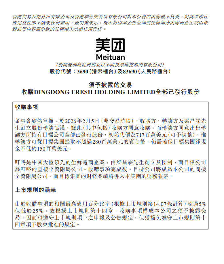 凤凰网科技讯 2月5日,美团公告,公司拟以7.17亿美元收购中国大陆领先的生鲜电商企业叮咚买菜的全部已发行股份。根据协议,转让方可从目标集团提取不超过2.8亿美元的资金,但需确保目标集团净现金不低于1.5亿美元。此次收购将使目标公司成为美团的间接全资附属公司,其财务业绩将并入美团的财务报表。